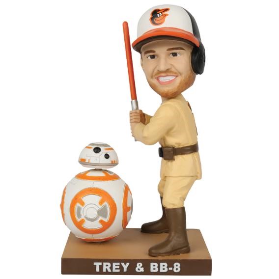 The Orioles capitalize on their team colors shared with BB-8 with this beanie and Trey Mancini bobblehead.